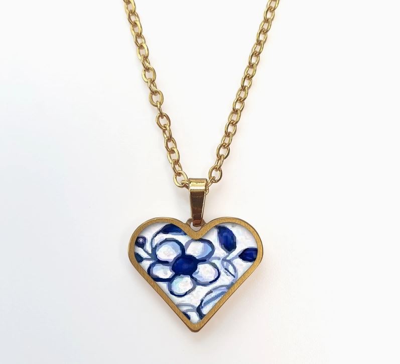 A heart-shaped, gold-plated stainless steel frame with a decorated ceramic pendant on an 18″ gold-plated stainless steel chain. Frame dimensions: 16mm x 15mm. Boxed. Care Instructions: Please do not bring this item in direct contact with alcoholic perfumes, lotions, hair sprays or other chemicals. The item is splash resistant but please do not shower with it or immerse in water.